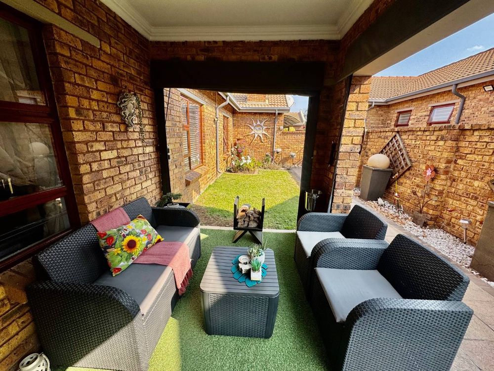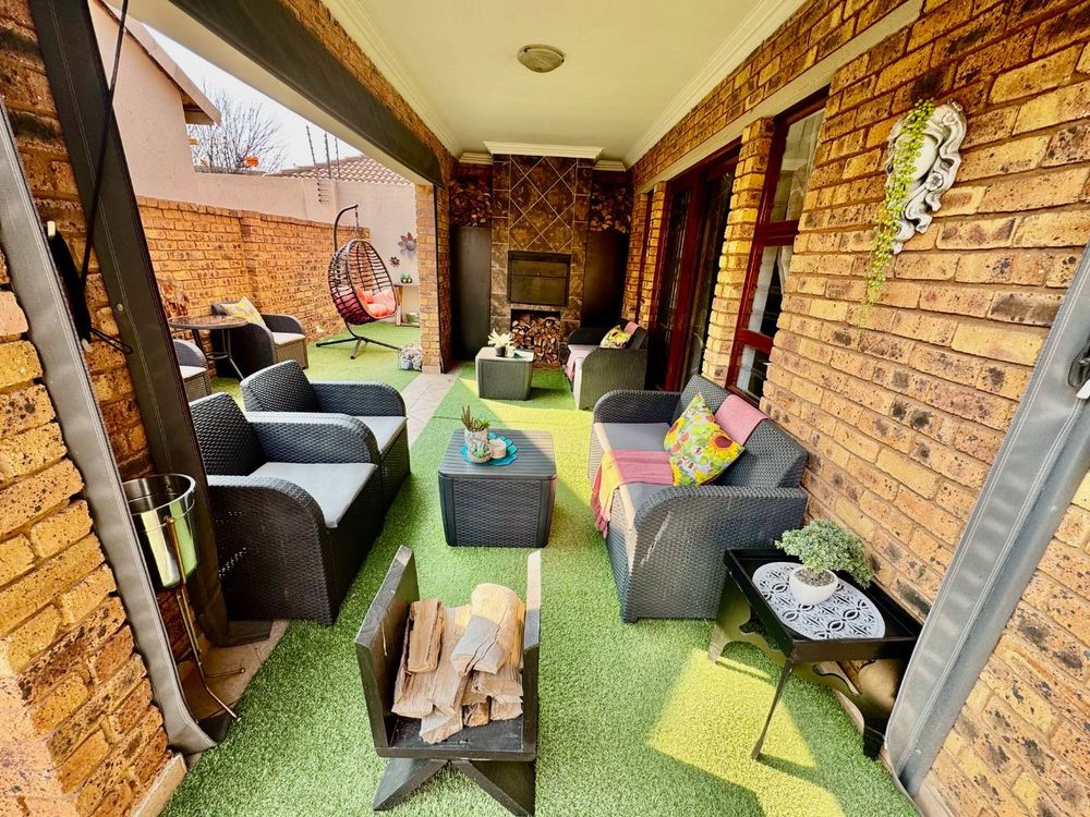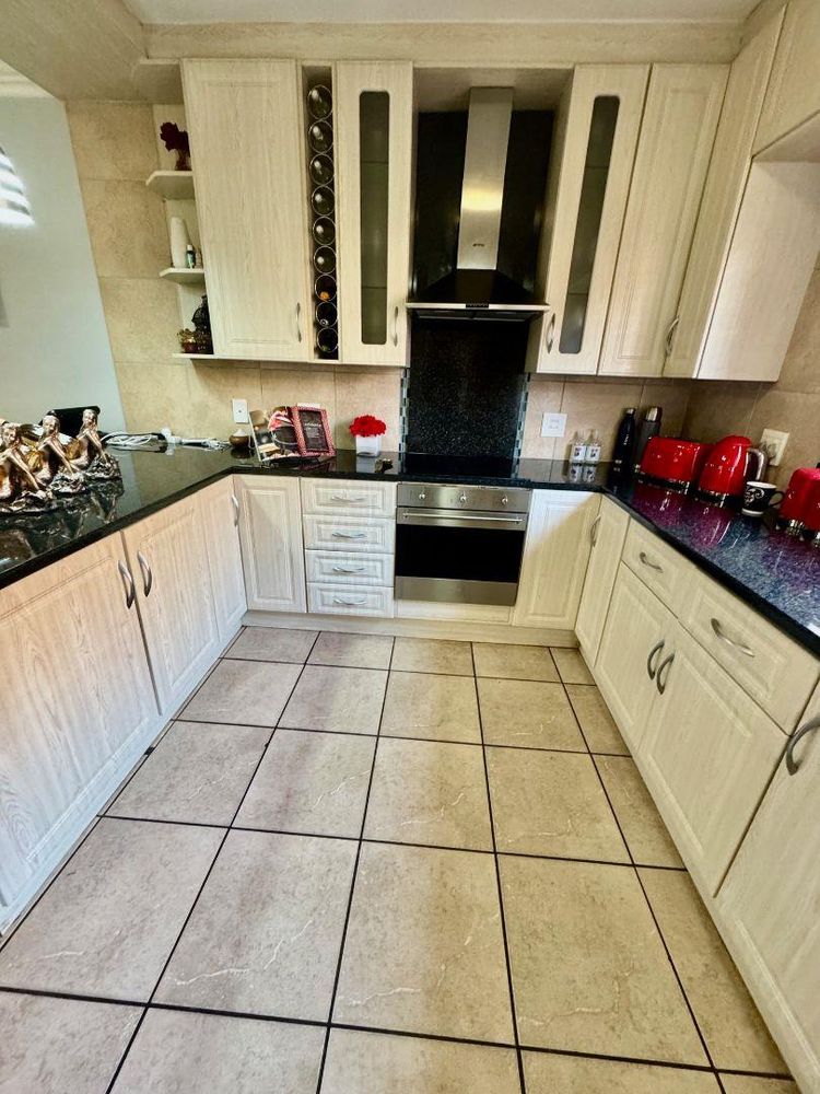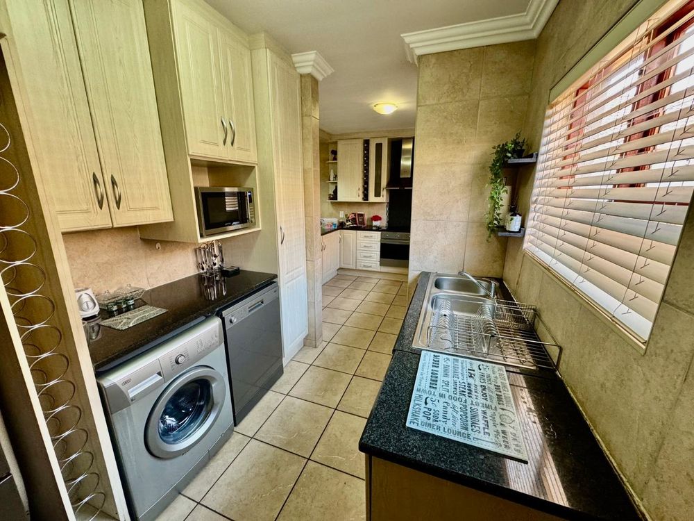 Large open plan lounge that leads to covered patio with built in braai and manicured private garden. Patio has newly installed awning. Kitchen is open plan with granite tops, breakfast bar, glass hob with extractor fan (SMEG), under counter oven (SMEG) + large separate scullery with space for 2 appliances and double sink. Living area is tiled.