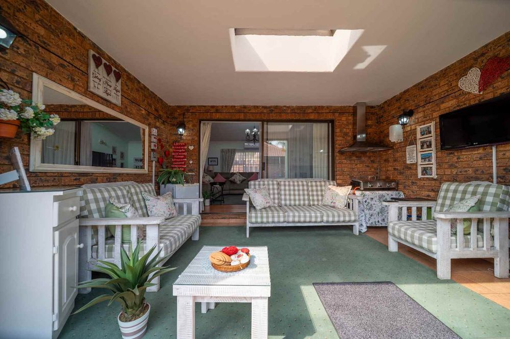 Entertainment Spaces – Comfortable mix of wood, tile, and carpet flooring with a patio featuring a built-in braai, overlooking the manicured garden.
