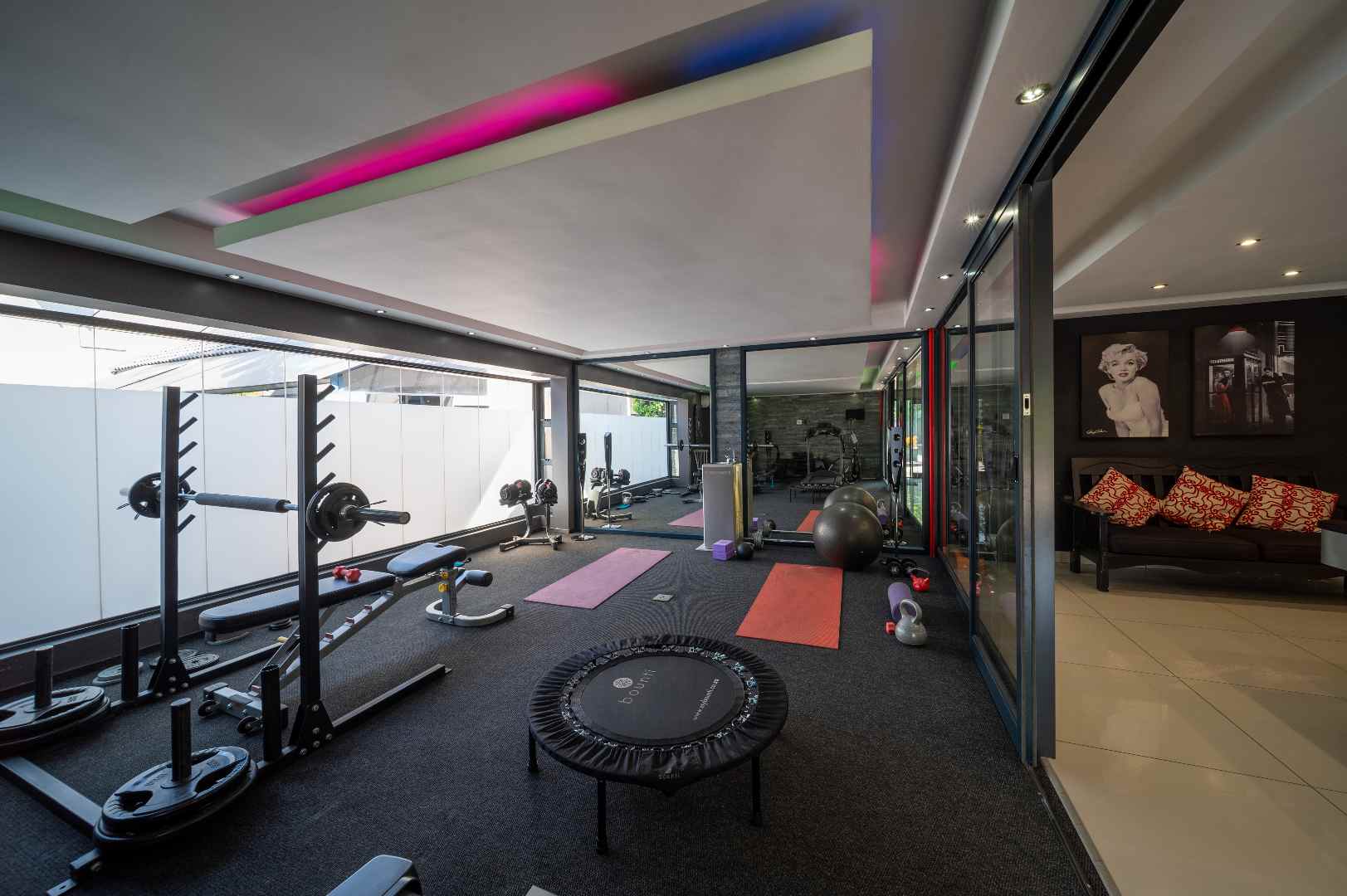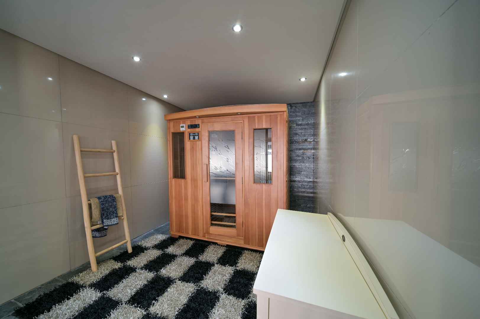 Dedicated gymnasium with sound system, Franke water cooler, and basin, leading to an infra-red sauna.