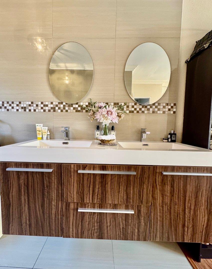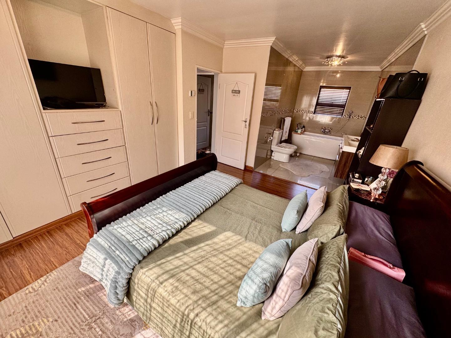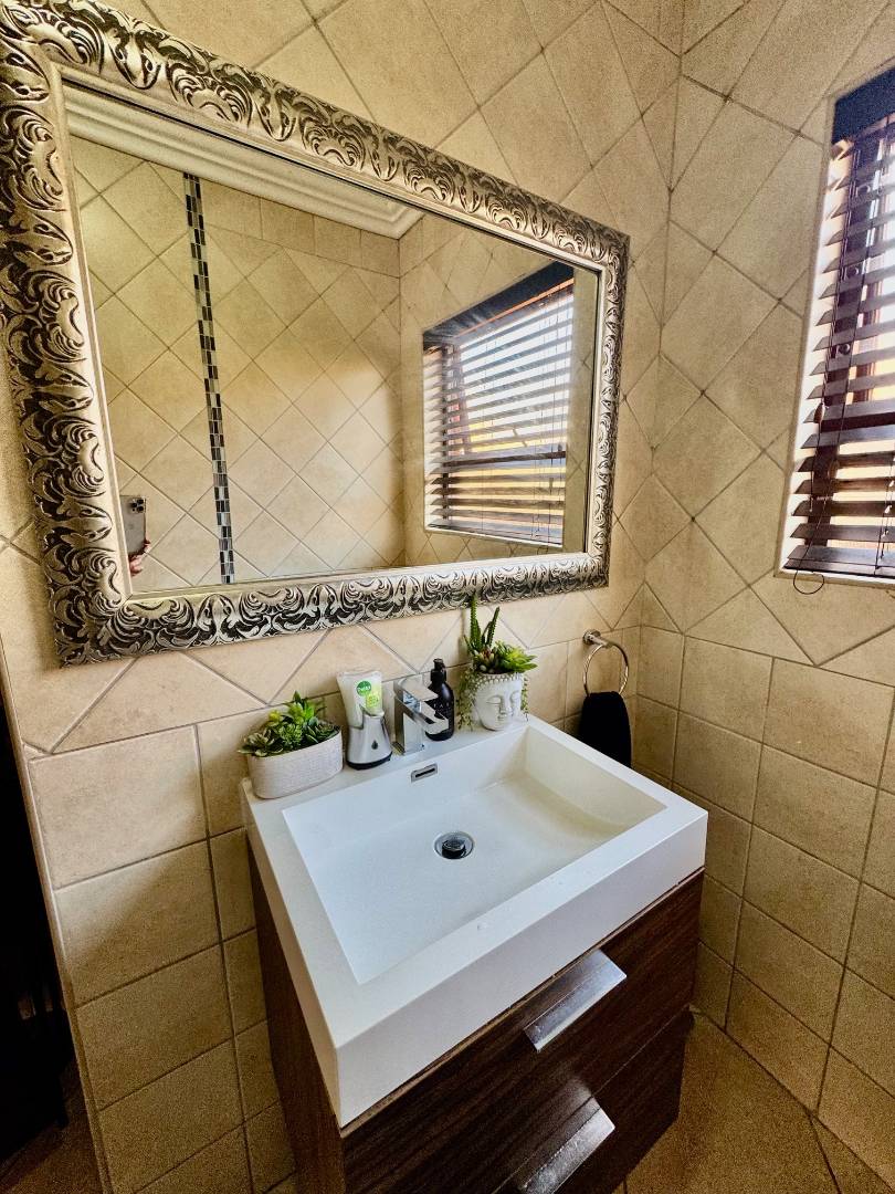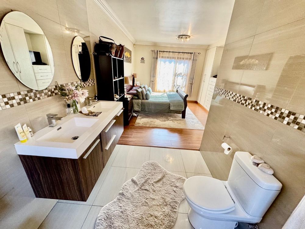 3 Spacious Bedrooms with laminated wooden flooring as well as new cupboards. The master bedroom is en-suite to a breathtaking bathroom with oval tub, double vanity and toilet. The second bathroom has shower, basin and toilet.