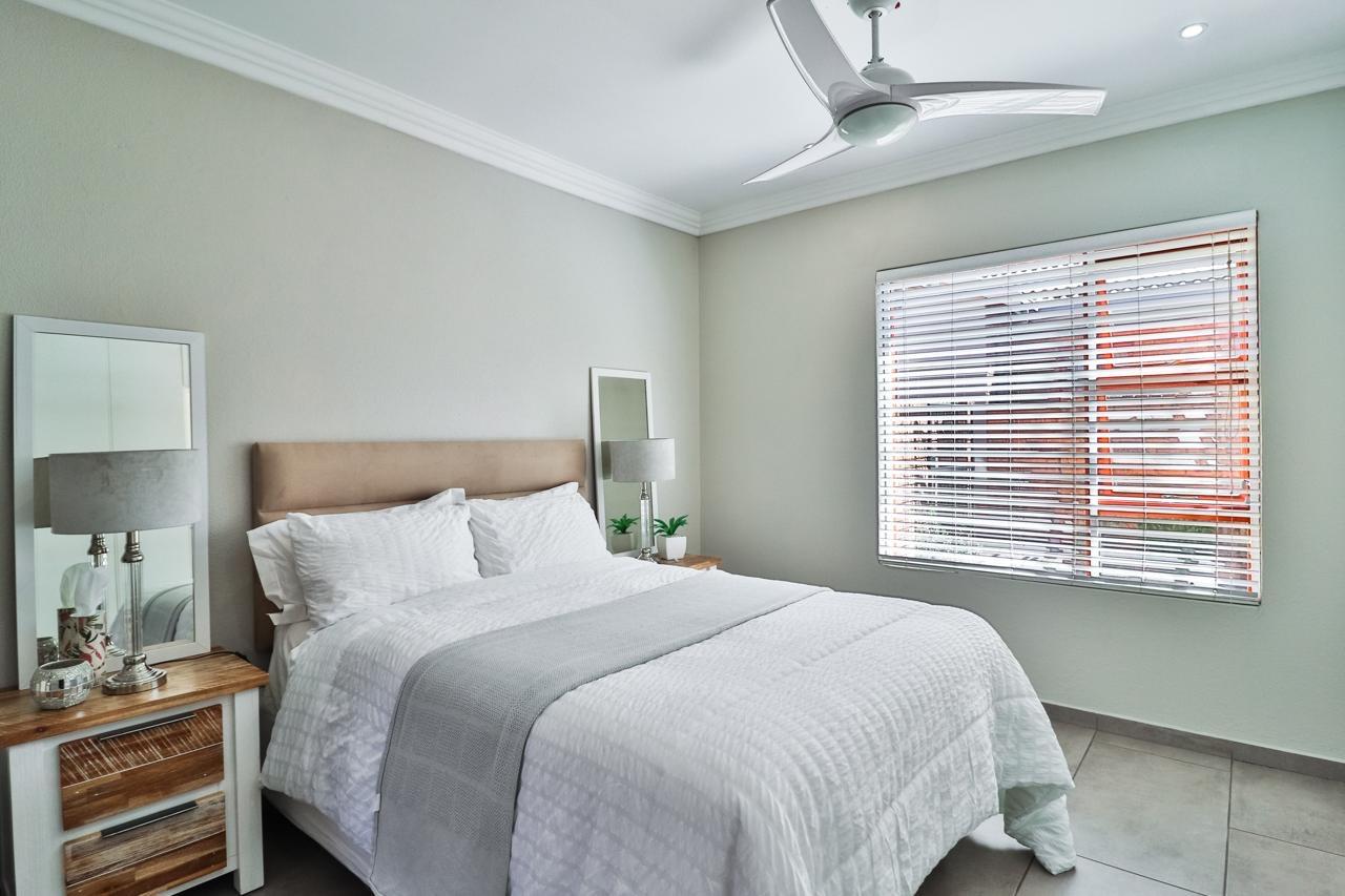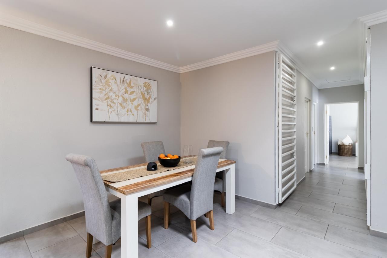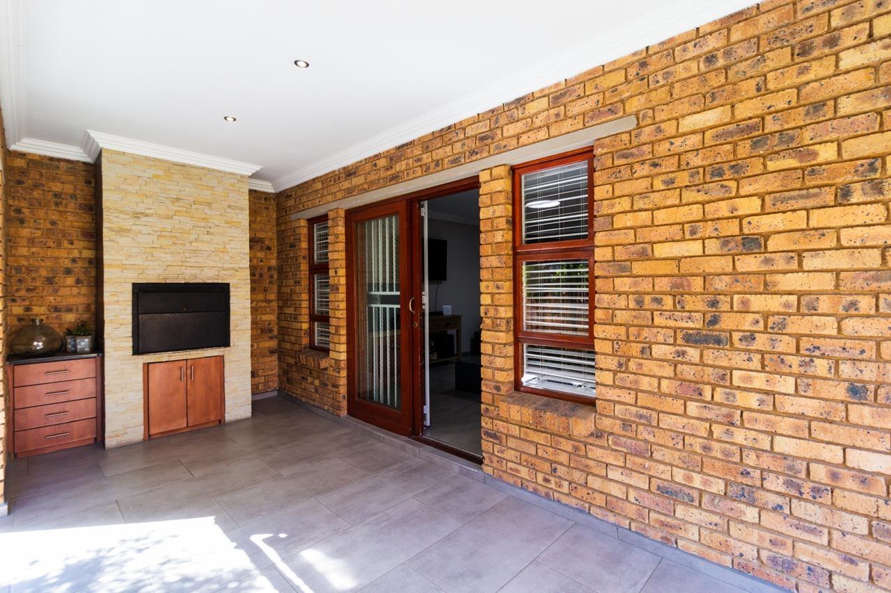 The home offers a spacious open-plan lounge that flows effortlessly onto a covered patio with a built-in braai — ideal for relaxed entertaining. Canvas blinds enclose the patio, allowing for year-round enjoyment, while the manicured private garden creates a tranquil outdoor retreat.