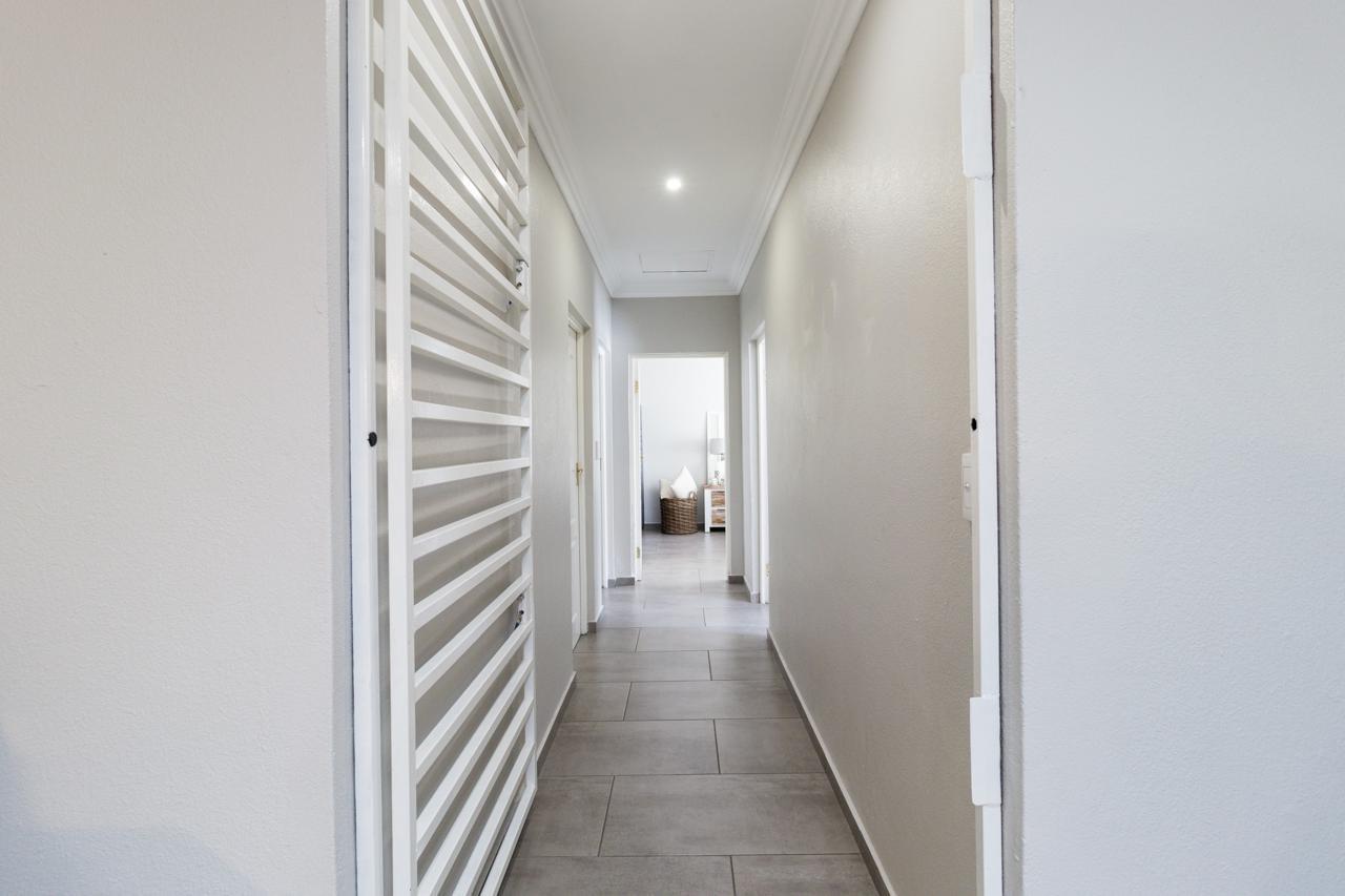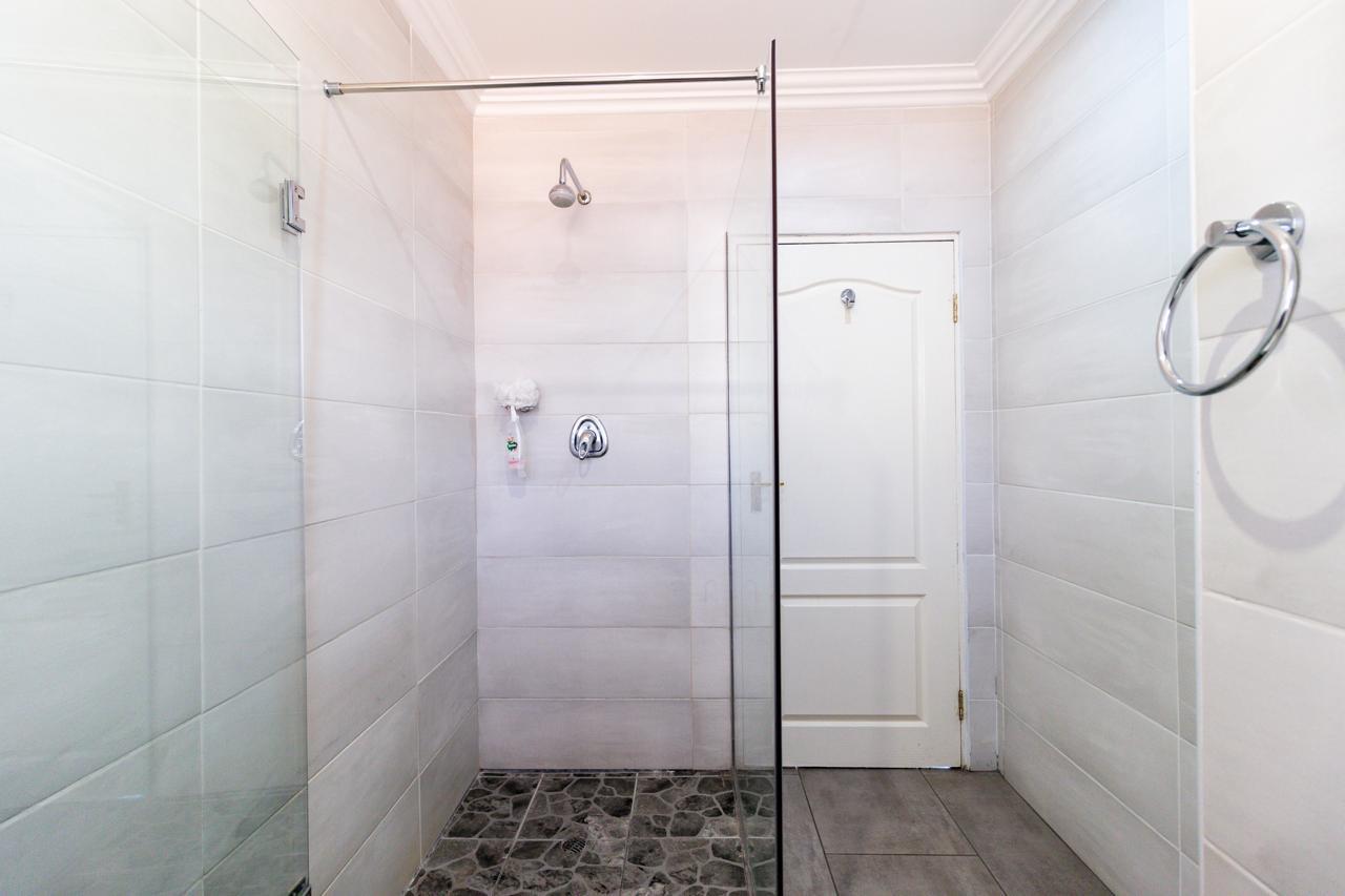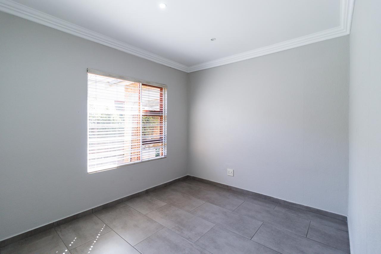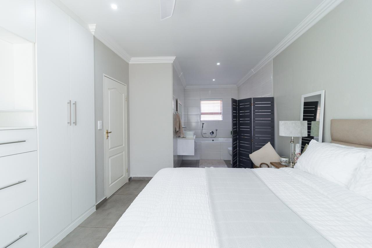 Accommodation includes three generously sized bedrooms, all fitted with newly built cupboards. The master bedroom boasts a luxurious en-suite bathroom complete with an elegant oval bathtub, vanity, and toilet. A second modern bathroom offers a shower, basin, and toilet.
