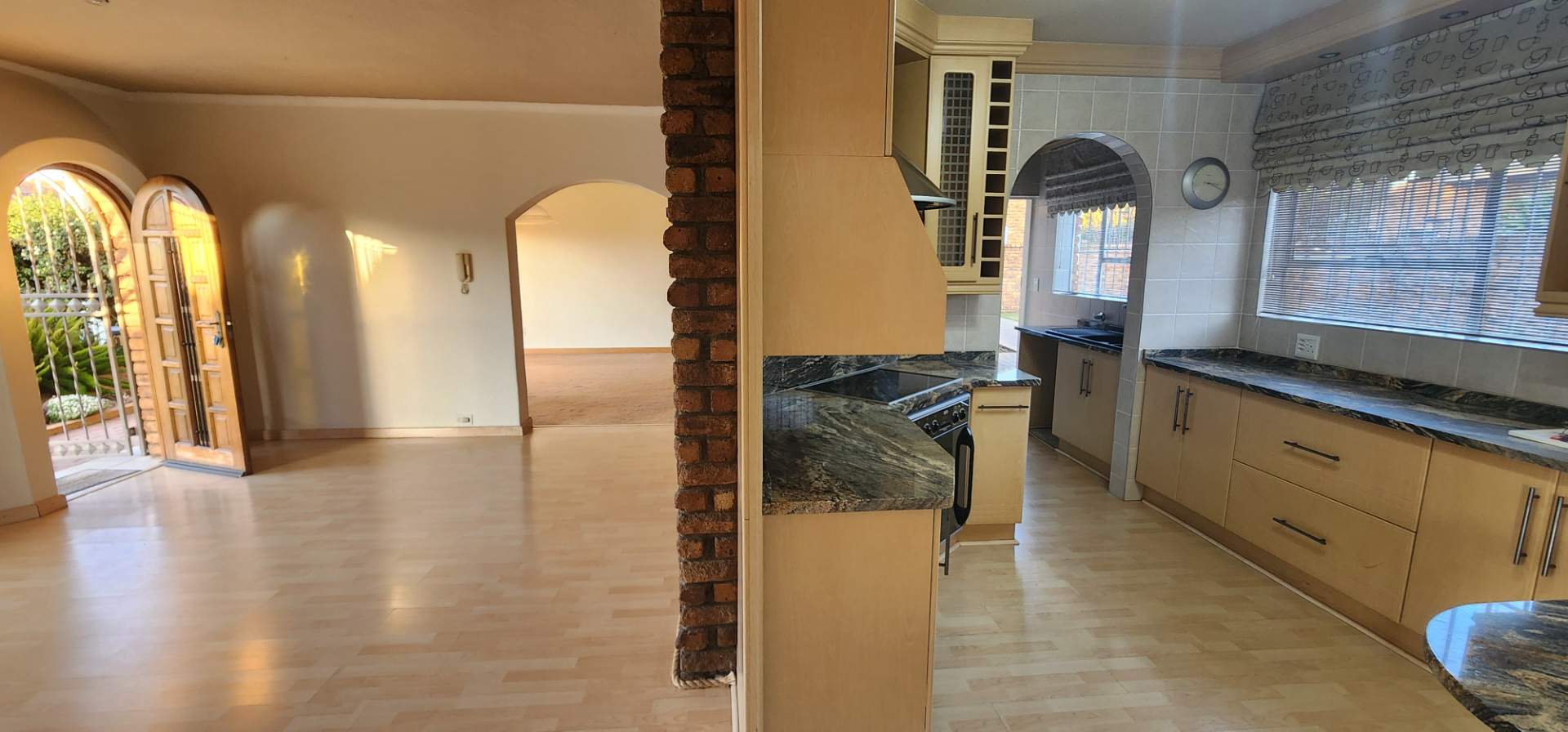 Step into spacious open-plan reception rooms that flow effortlessly into a contemporary kitchen, complete with elegant Caesarstone countertops, a breakfast bar, and a well-appointed scullery/combo laundry. The laminate wood floors add warmth and elegance to the space, creating a perfect environment for both everyday living and entertaining.