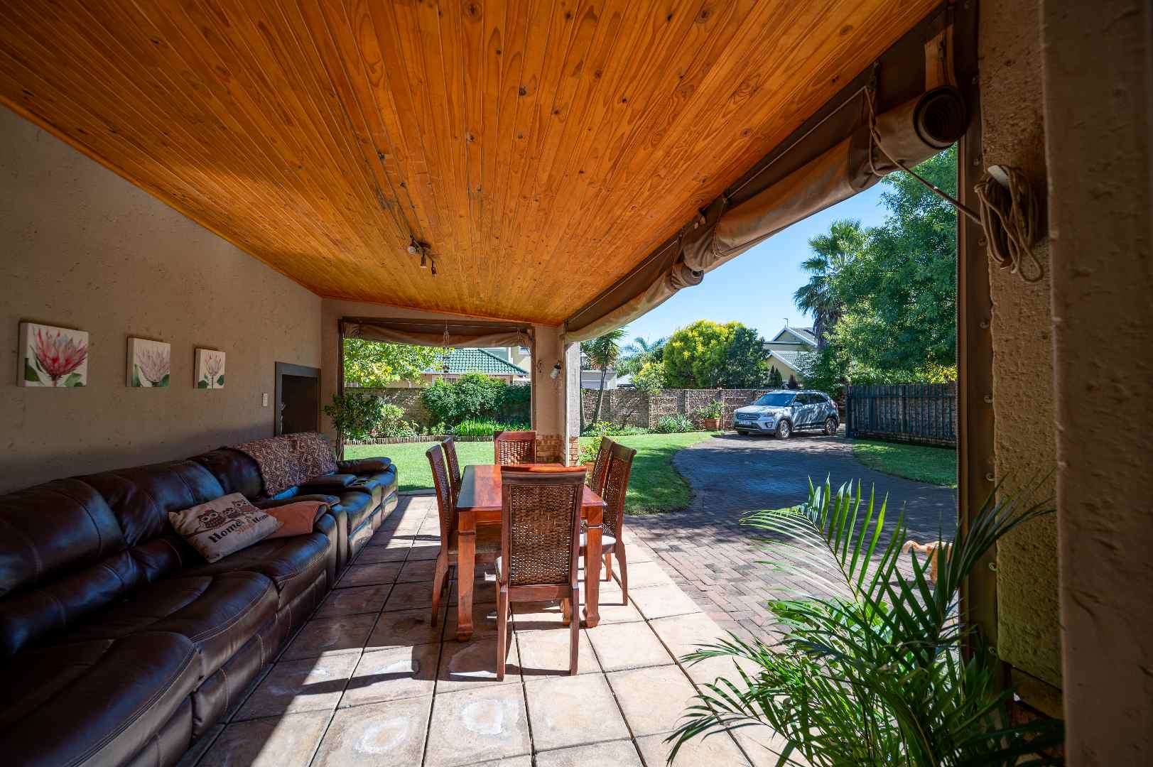 - The living space opens onto a covered patio enhanced with shade sails, perfect for cozy evenings overlooking over the manicured, well-sized garden.