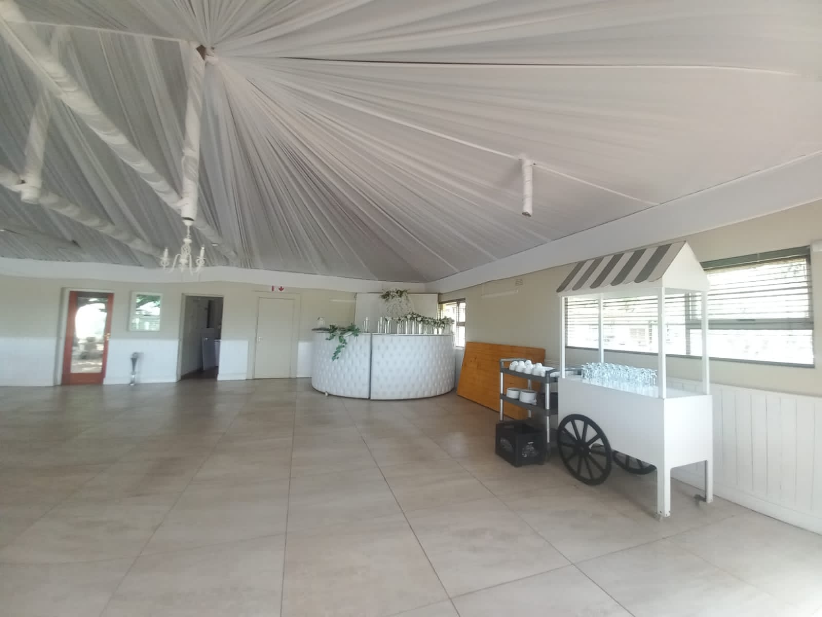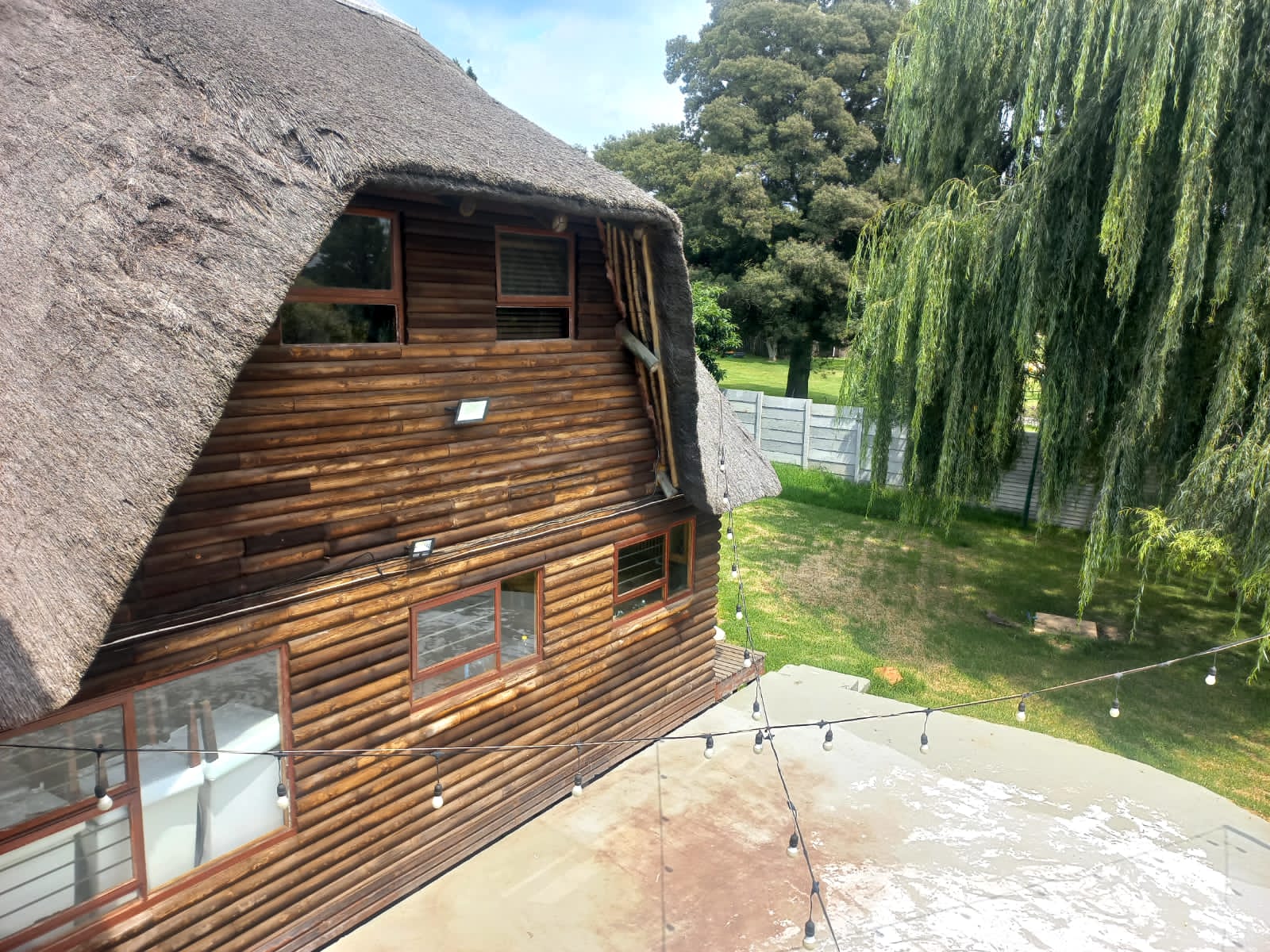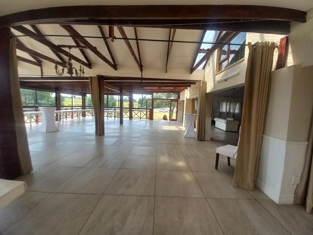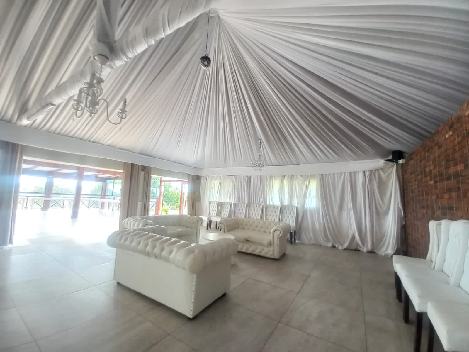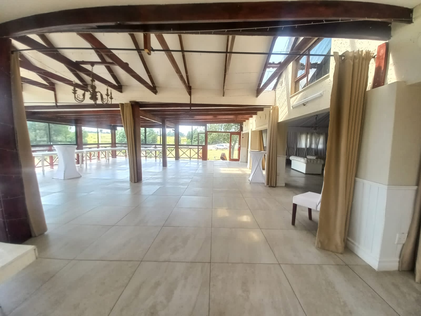 A stunning thatched function hall with a rustic ambience. It has lots of doors and windows opening up to allow light and fresh air into the room.