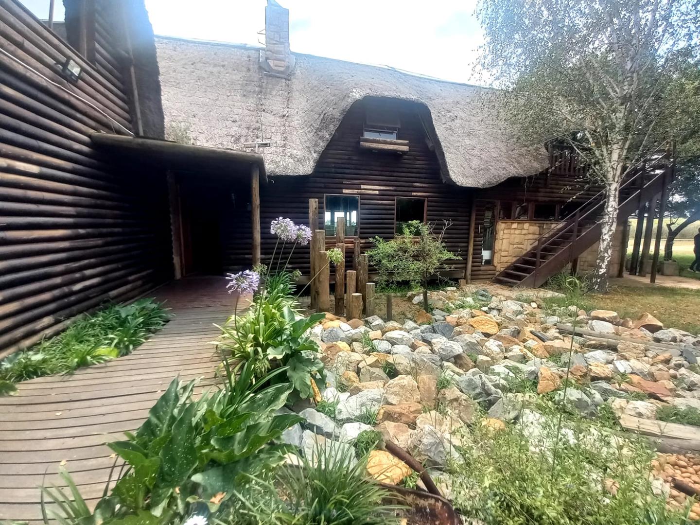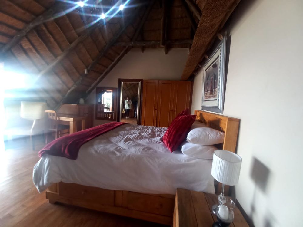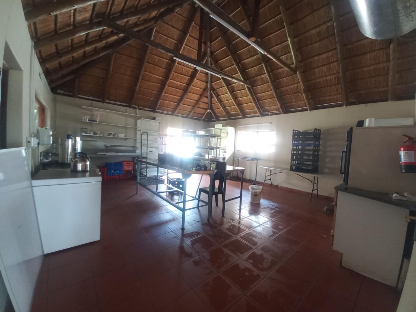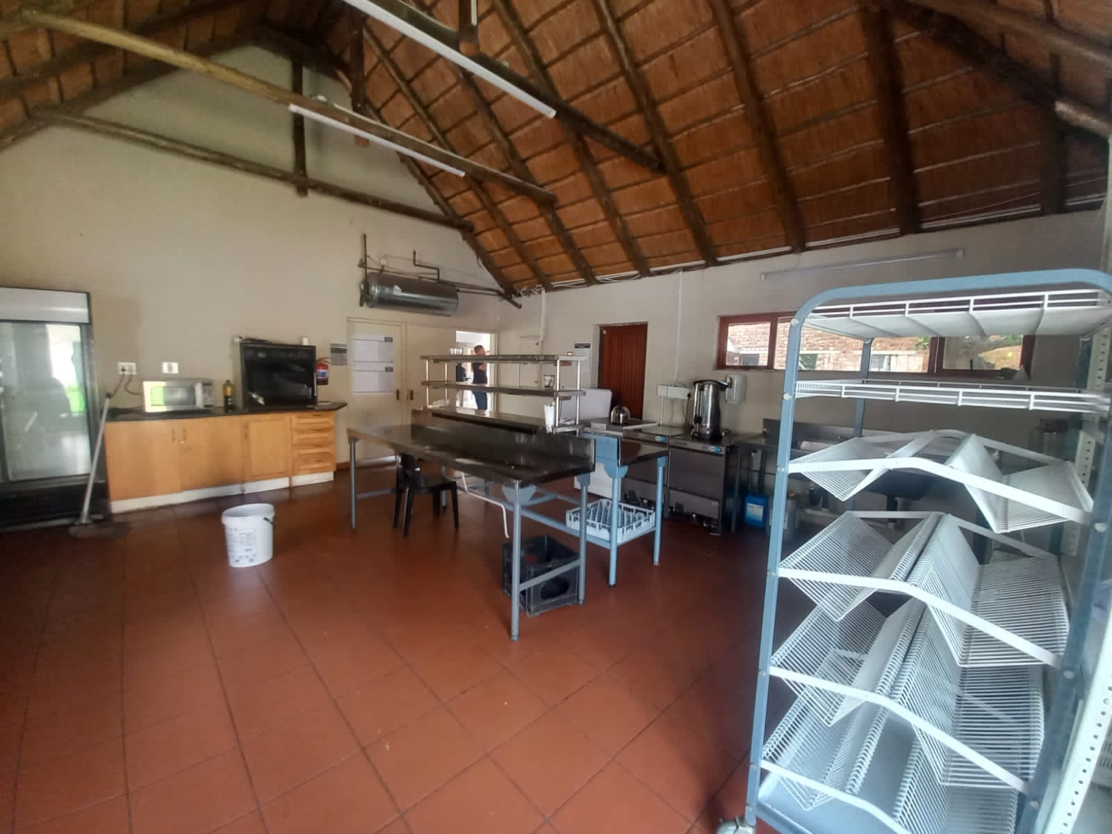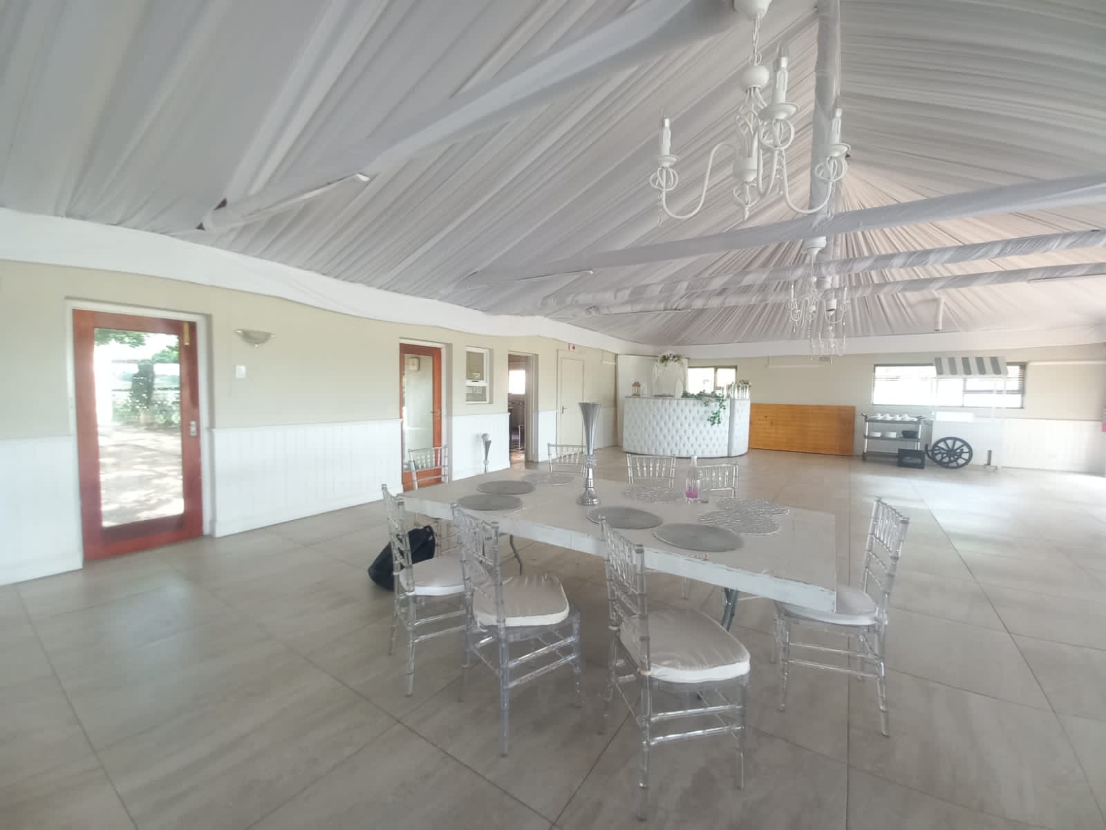 A stunning thatched function hall with a rustic ambience. It has lots of doors and windows opening up to allow light and fresh air into the room.